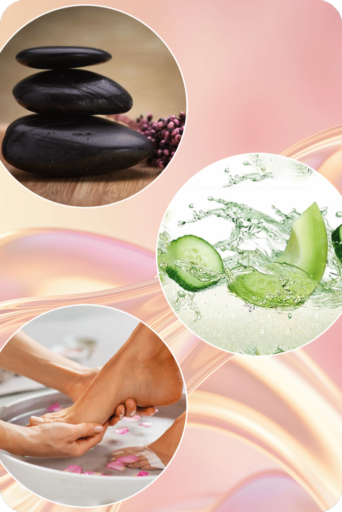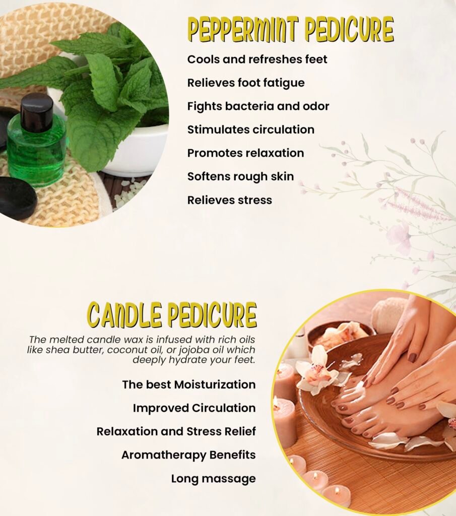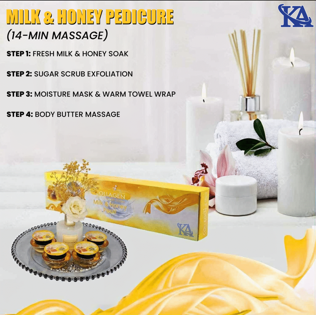 Indulge your feet in a warm soak of fresh milk and honey that deeply hydrates and softens the skin. A gentle sugar scrub smooths away roughness, followed by a moisture mask with a warm towel wrap for ultimate relaxation. Complete your experience with a soothing hot stone and candle oil massage, leaving your feet silky soft and refreshed.